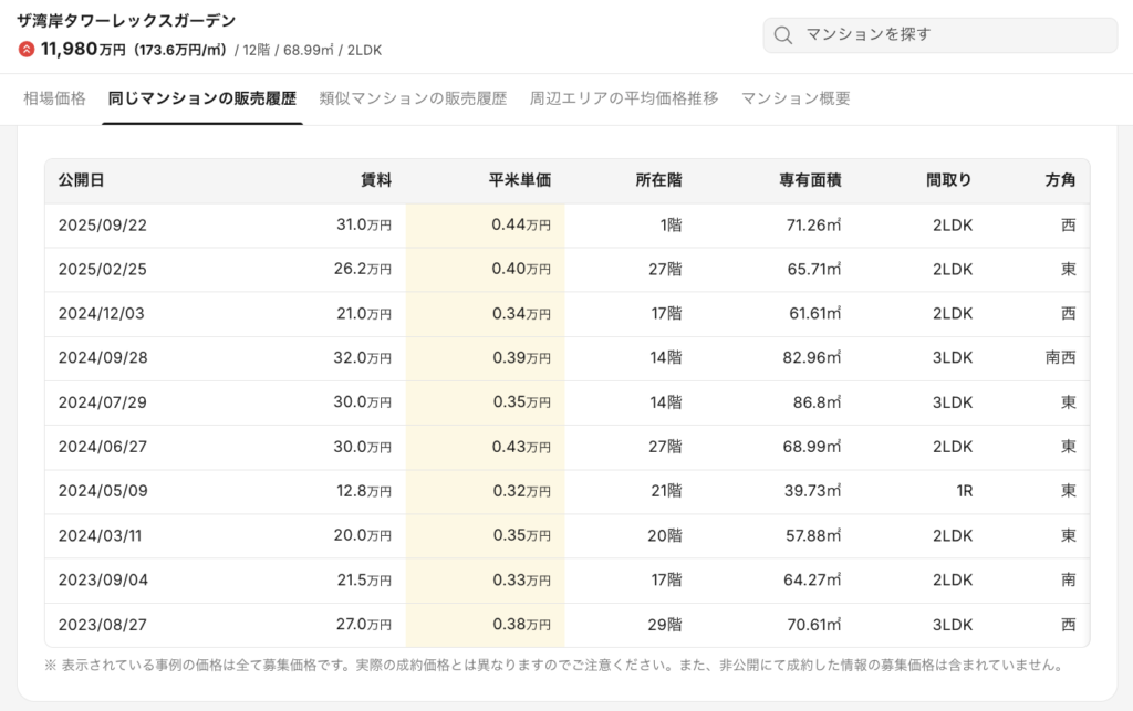 実際の募集履歴からも、湾岸エリアのタワーマンション価格上昇が確認できます。