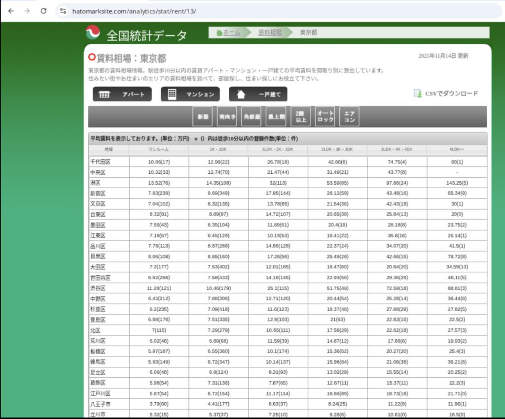 「全国統計データ」(ハトマークサイト)では、2025年11月時点の賃貸マンション平均賃料(駅徒歩10分以内)を間取り別・区別に公開している。例えば港区・中央区・渋谷区の平均賃料は次の通りであり、1LDK〜2DKでは20万~32万円、2LDK〜3DKで約31万〜53万円、3LDK以上では40万~87万円を超える。これらは2020年当時の平均家賃(2LDKで25万円前後)と比べ明らかに高い。