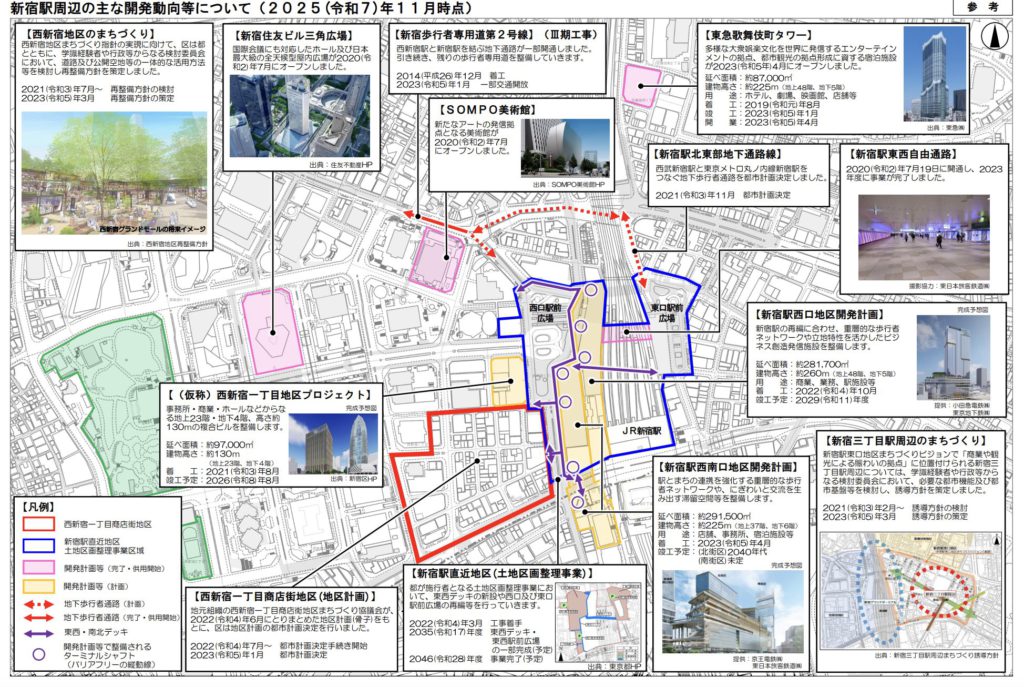 現在は、西新宿一丁目商店街地区、西新宿三丁目西地区、西新宿五丁目南地区、西新宿六丁目16番地区などで、それぞれ段階的にまちづくりや再開発の検討・手続きが進められています。東京都の再整備方針では、西新宿では2040年代まで続く大規模な再開発の方向性が示されており、街区単位で都市機能の更新が進められていく計画です。
